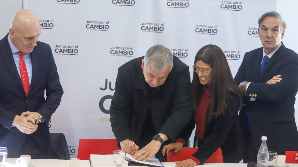 Las máximas autoridades de los partidos fundadores de Juntos por el Cambio Gerardo Morales (UCR), Maximiliano Ferraro (Coalición Cívica), Miguel Ángel Pichetto (Encuentro Republicano Federal), Federico Angelini y Eduardo Macchiavelli…